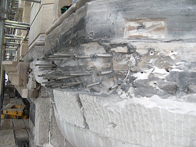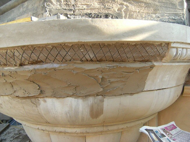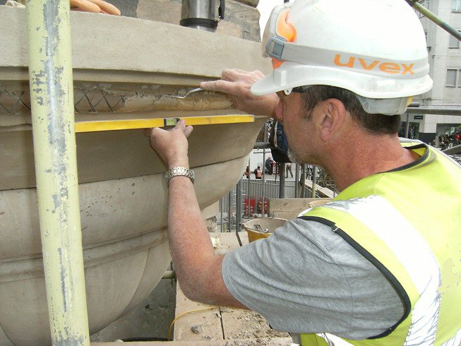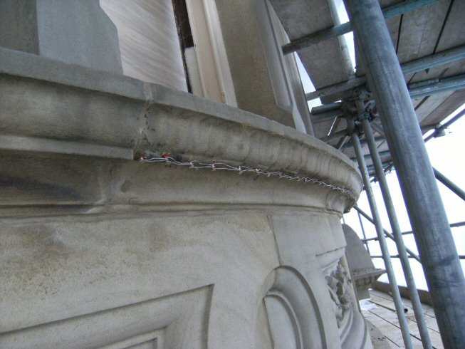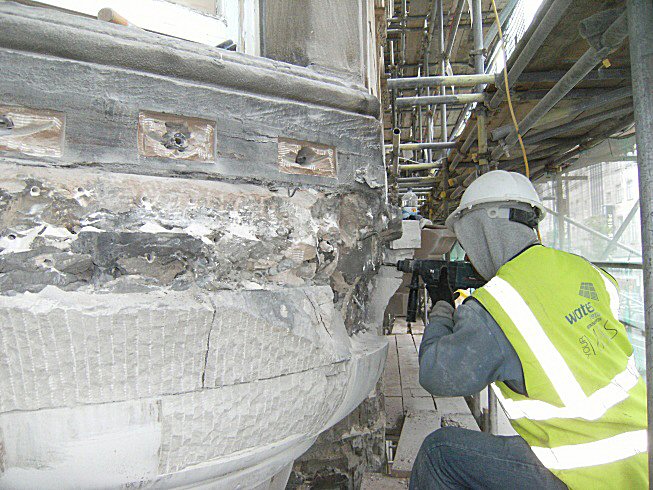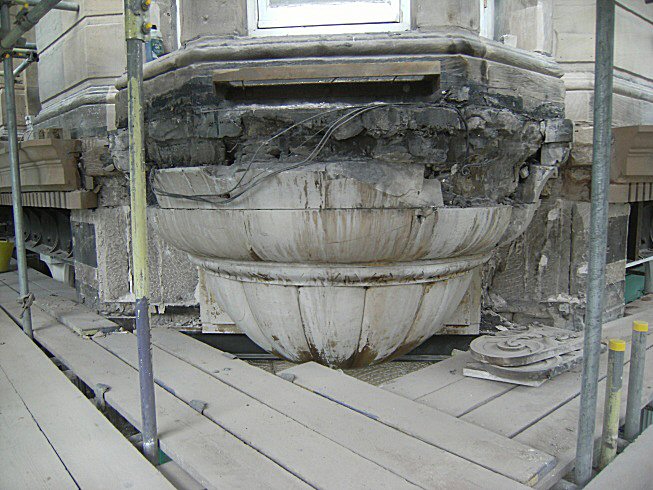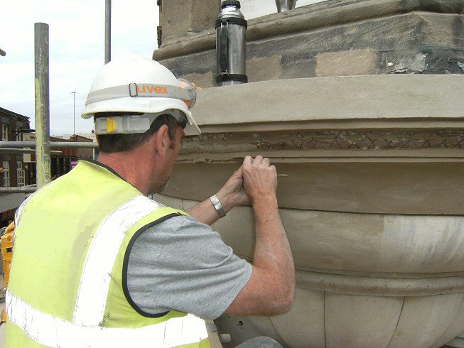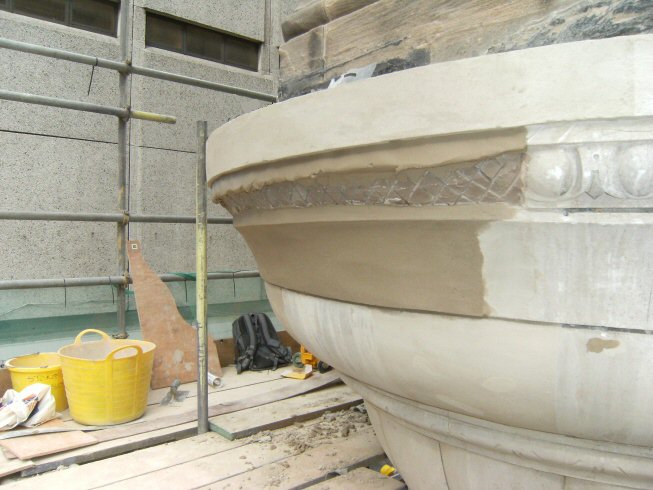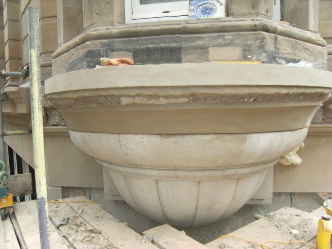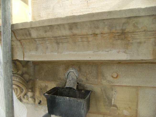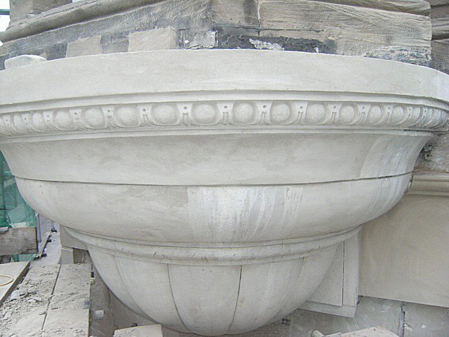 This project involved many different aspects of masonry work. We had to restore vast amounts of stonework using Lithomex Masons Mortar as approved by the Conservation Officer. We also had to build ten stone pillars spanning the three elevations including eight window heads. The works also included fixing all of the granite plinths, re-pointing as required and various indents to cornice, drips and window jambs. The images show the restoration of the Portland stone radius egg and dart moulding to the oriel window.