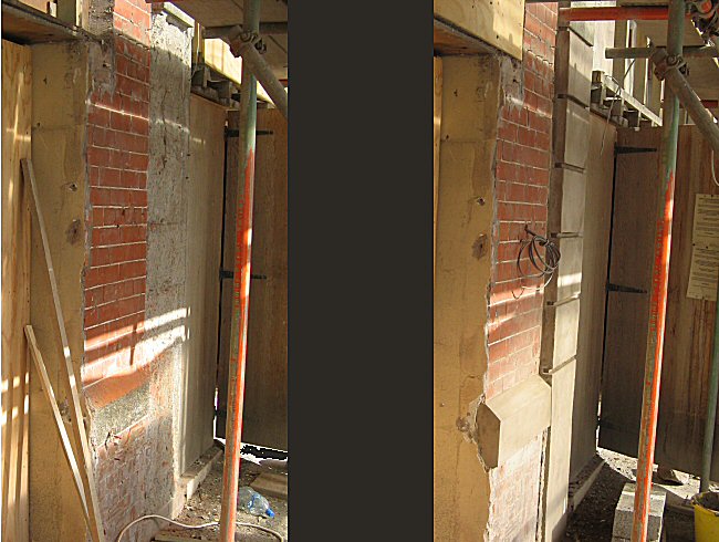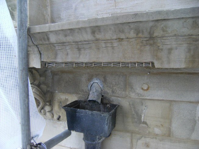 This project involved extensive restoration works to the two facades, a 100% re-point and sanding down of the full wall to the extension to remove loose and friable material. The restoration to the cornice, window cills, hood moulds and plinths was carried out using Lithomex Masons' Mortar. The photographs illustrate the use of stainless steel reinforcement to the drip detail of the cornice, the window cills and the finished restoration to the cornice. The Boot Inn signage was originally a plain stone panel painted blue and still bearing numerous old fixings. Once the paint had been stripped, it became apparent that the name could not be carved directly into the stone because of underlying damage. The old fixings were removed and the panel rendered using a lime based mortar into which when cured the name was carved.