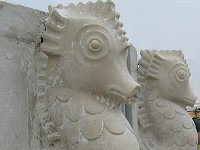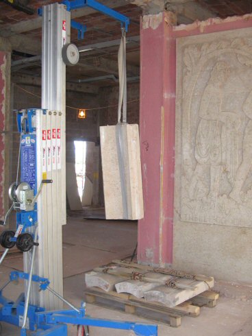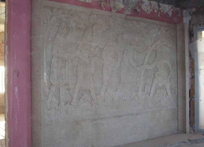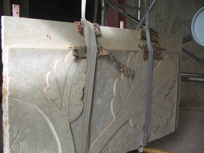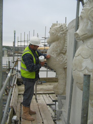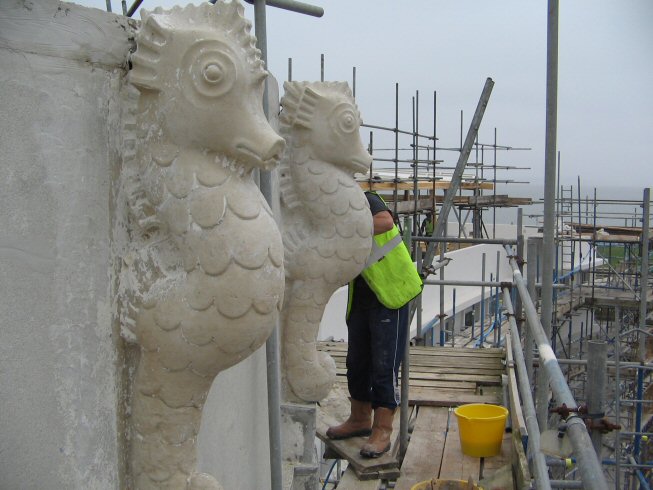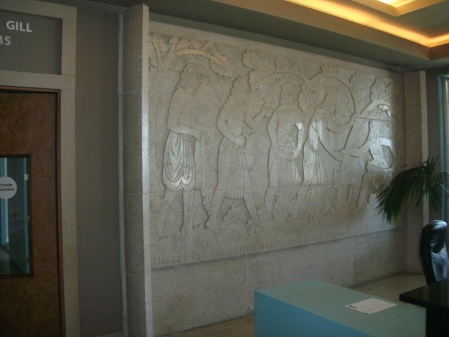 This project involved the cleaning, repair and redefining of details to the Portland stone seahorses that were carved in situ by Eric Gill. The moulded marble main entrance and the marble bench seats either side were dismantled prior to alterations taking place and were reinstated after all the works were completed. Internally we dismantled the relief named " Odysseus welcomed from the sea by Naussicca" which was also carved by Eric Gill and lettered by Laurie Cribb. We then re-sited it where it now has pride of place behind the reception desk in the lobby. A very satisfying project.