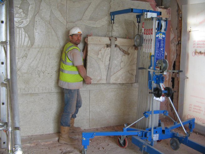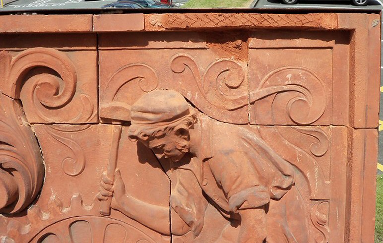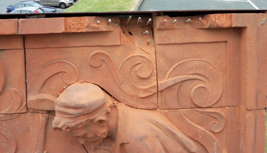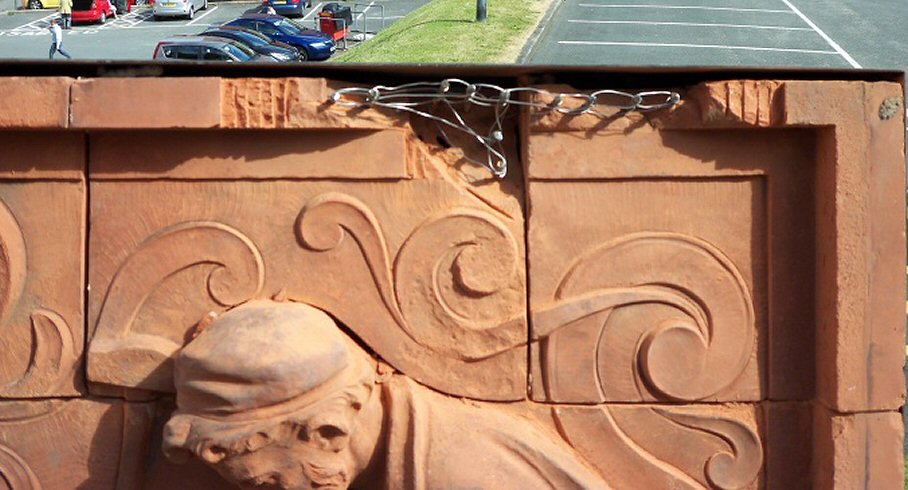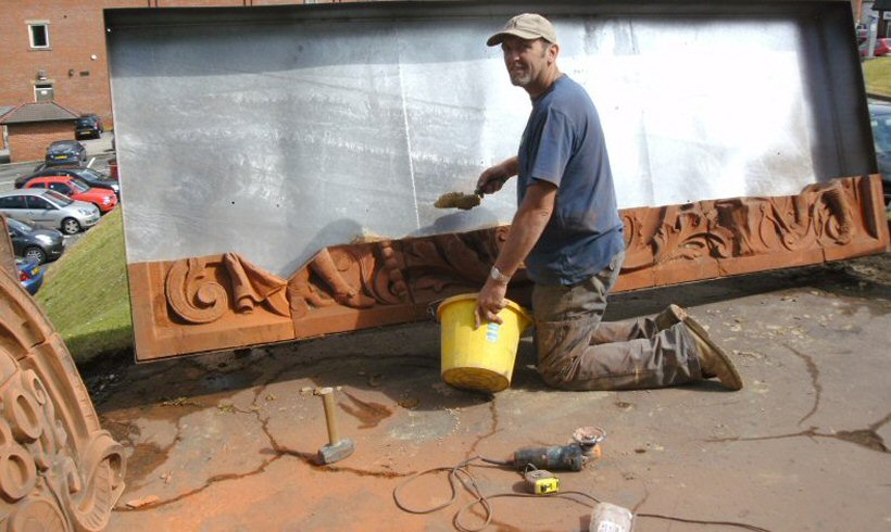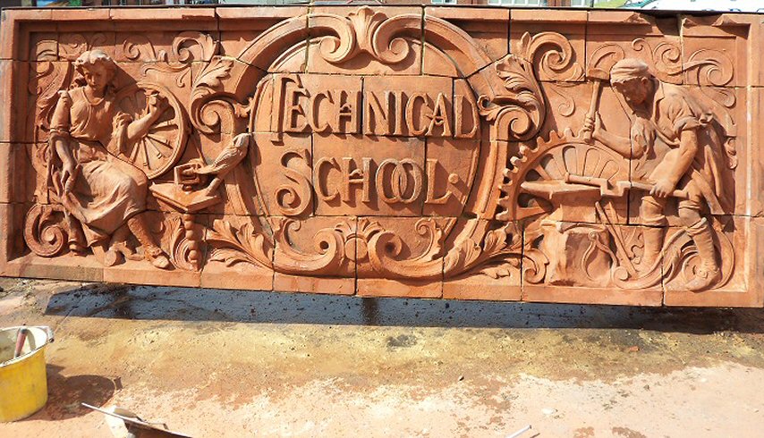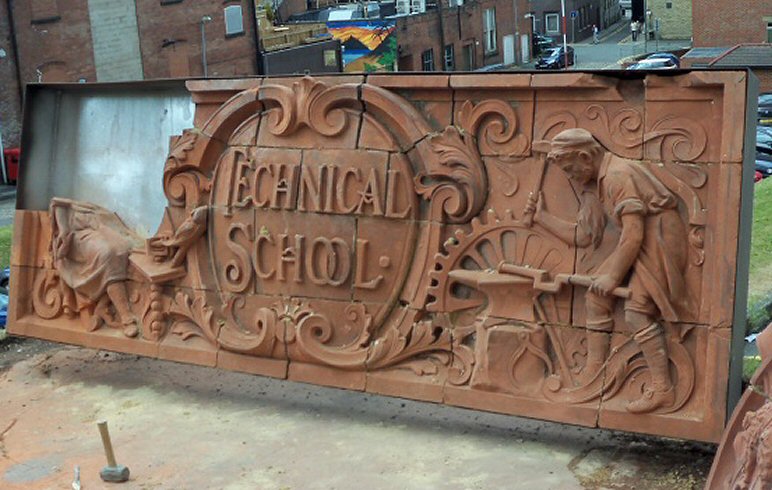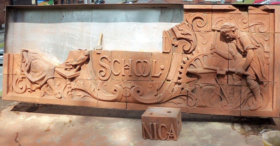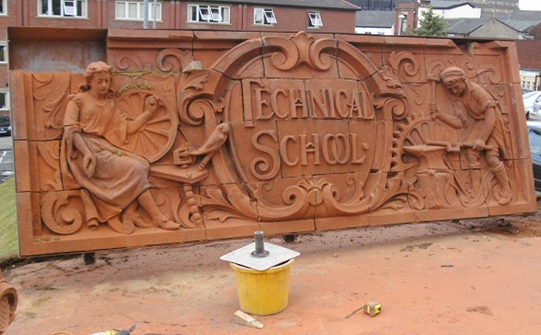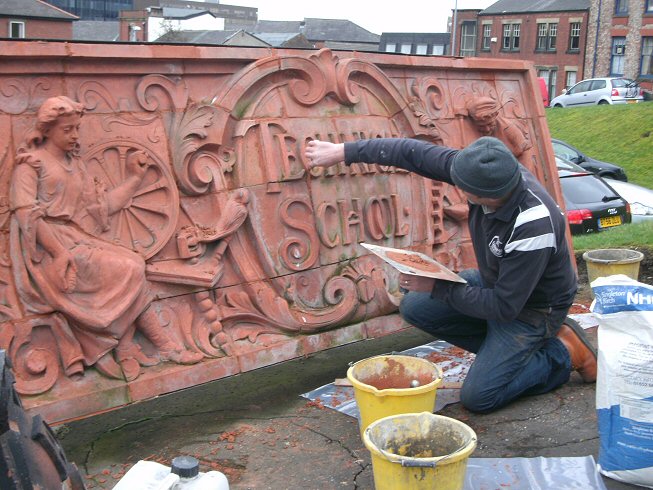 This project was carried out on behalf of Rochdale Metropolitan Borough Council. All of the terracotta frieze panels had been saved at the time of demolition. Quite a few of the units had been badly damaged so had to be restored. The decision was taken to display the frieze panels on the old school site housed in metal frames. The friezes were bedded and pointed using a natural hydraulic lime and river washed sand mortar mix as approved by the Conservation Officer.